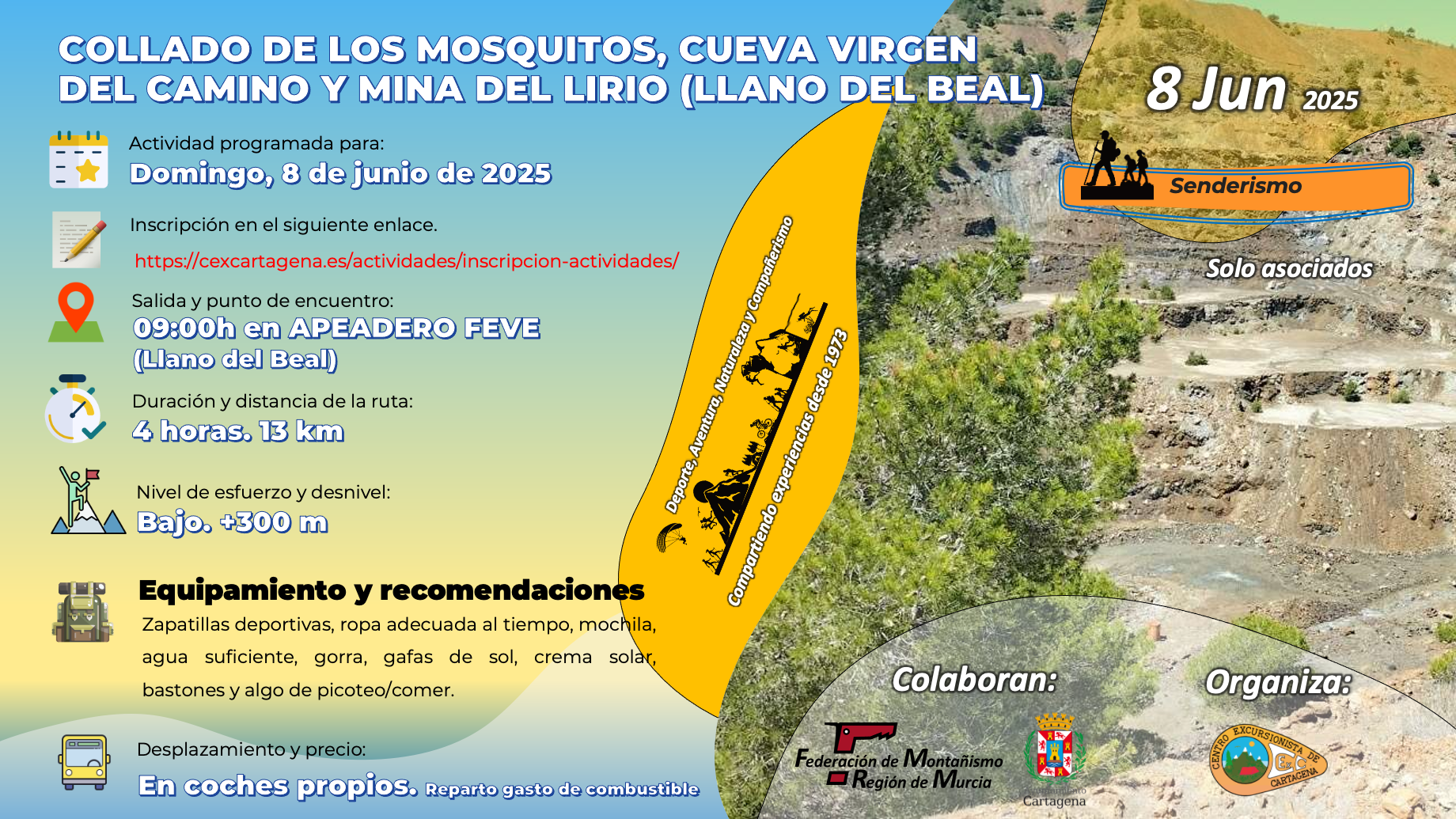 Selecciona la actividad: 8-06-2025. SENDERISMO. COLLADO DE LOS MOSQUITOS, CUEVA VIRGEN DEL CAMINO Y MINA DEL LIRIO- LLANO DEL BEAL.