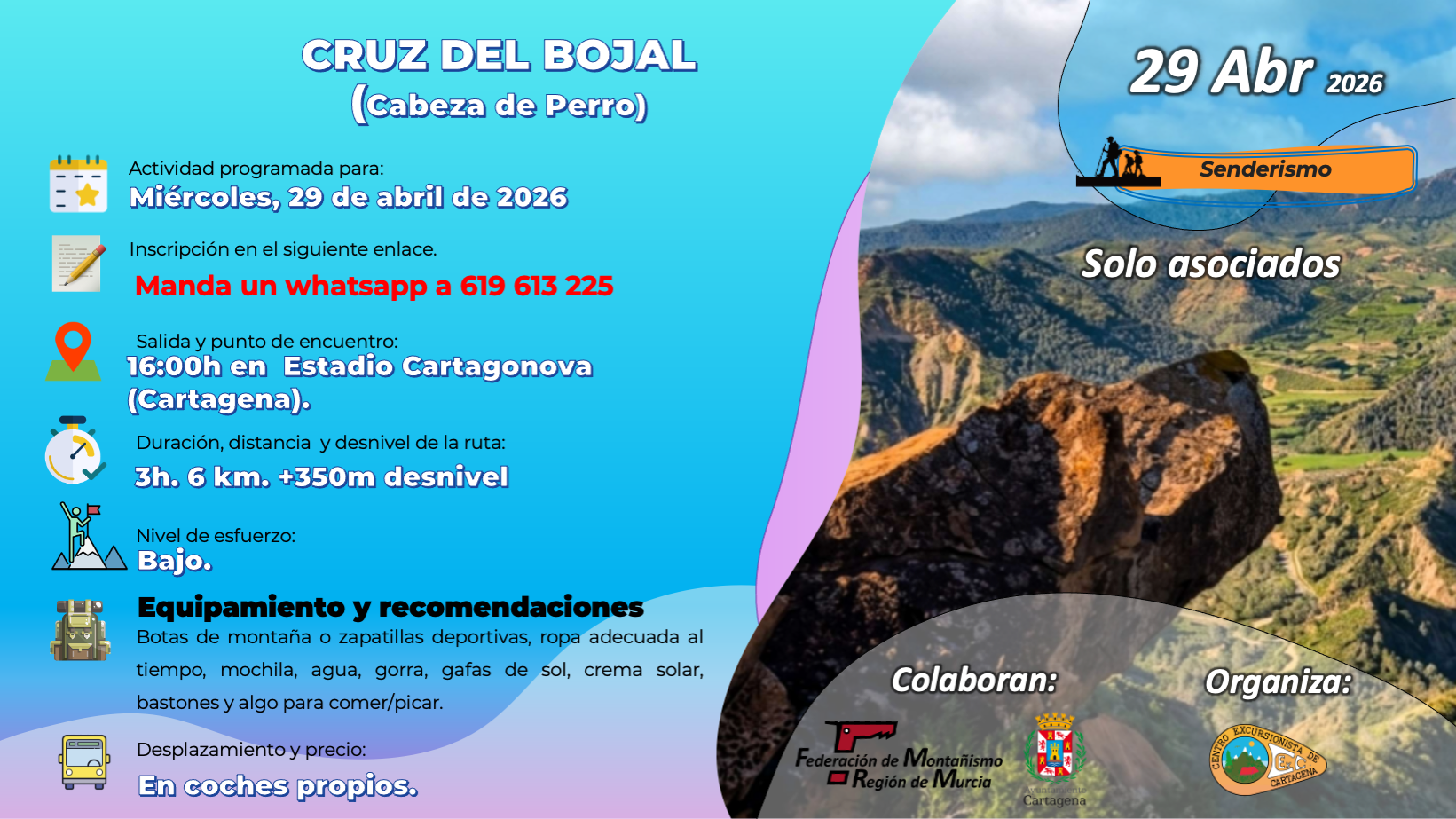 Organización y logística La salida es a las 16:00 desde la puerta del Estadio Cartagonova, con regreso estimado a las 21:00. El desplazamiento en vehículos particulares cuesta 4 € por persona, aportados al conductor. También se puede acudir directamente a la Ermita de San Antón del Bojal a las 16:50. La inscripción se realiza vía WhatsApp al guía, 619 613 225, confirmando si se aporta coche.